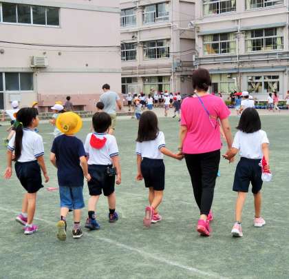 休み時間が終わり、教室に戻る際には大好きな先生に子どもたちが集まってしまいます。これはしかたのないことです。遊んだ後は、しっかり石けんで手を洗って、アルコール消毒をして教室に入ります。