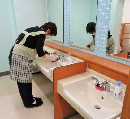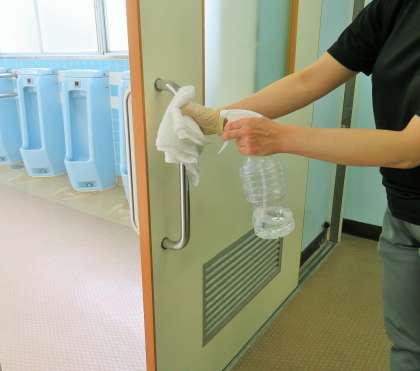 子どもたちの休み時間後や下校後には、先生や主事がトイレ、手すり、ドアノブ、共用の教材・教具などの消毒を行っています。