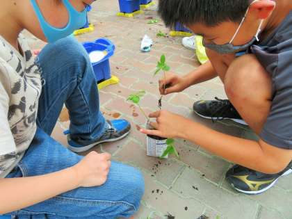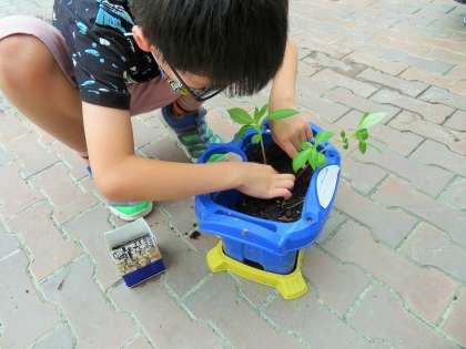 ポットで育てていたホウセンカの苗を鉢に移しました。