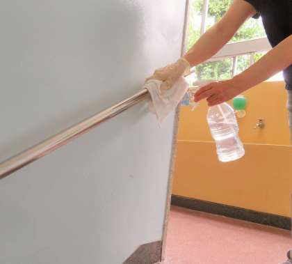 子どもたちの休み時間後、下校後には、主事がトイレ、手すり、ドアノブなどの消毒を行っています。