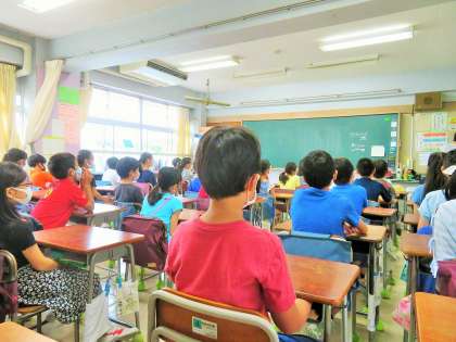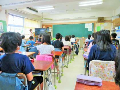 始業式後は、まとめの授業をしたり、お楽しみ会をしたり、夏休みの過ごし方を話しあったりしていました。
