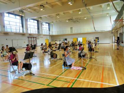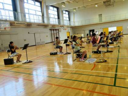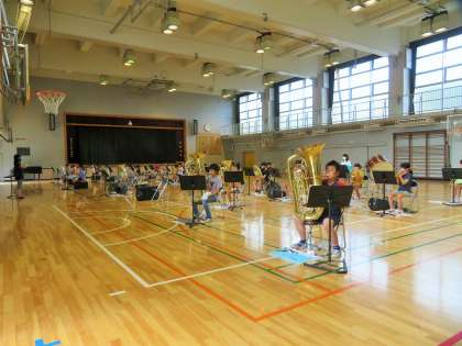 金管バンドの朝練習は、夏休みもがんばっています。体育館に入ると、いつも「おはようございます!」の爽やかなあいさつがあり温かい気持ちになります。現在は、運動会に向けて「校歌」を練習をしています。