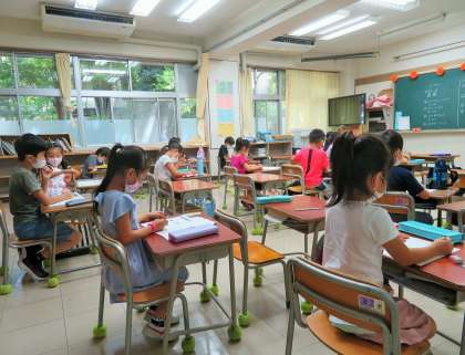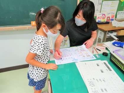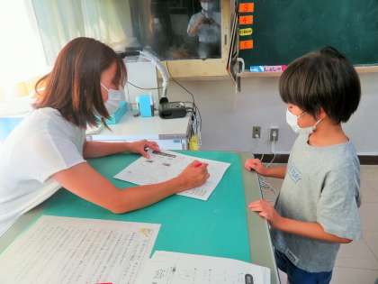 今日は夏季補習教室の7日目。夏休み中ですが、子どもたちは元気いっぱいに登校しています。「やる気コース」「発展コース」ともに集中して取り組んでいました。