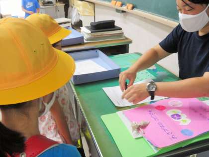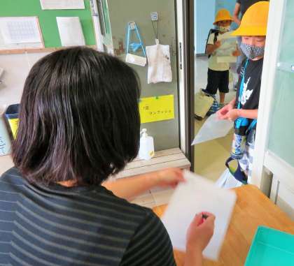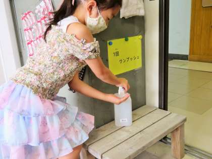 健康観察カードのチェックを受けてから入室します。その後、ていねいな手洗い、アルコール消毒をして着席します。ソーシャルディスタンスにも気をつけています。