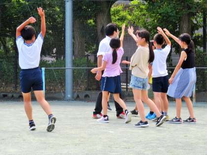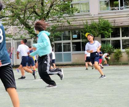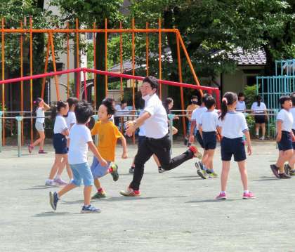 松丘小学校の休み時間は、子どもと教師が一緒に遊ぶ「共遊び」を奨励しています。
