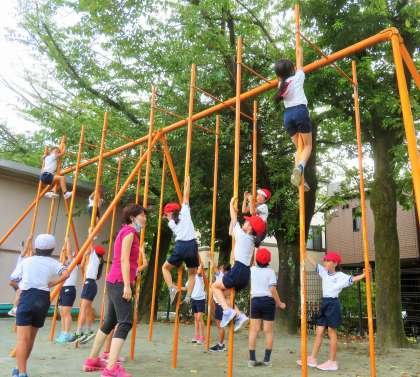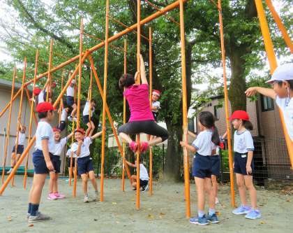 鬼ごっこやボール遊び、一輪車、うんてい、登り棒、鉄棒が人気です。担任の先生も登り棒に挑戦です。それを応援する子どもたちの姿がありました!