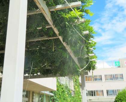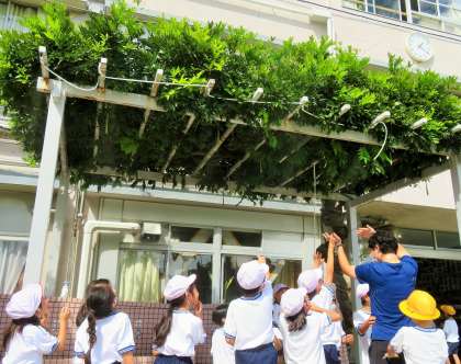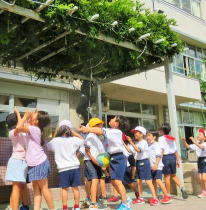 昼休み後に、ミストシャワーを浴びる1年生の様子です。