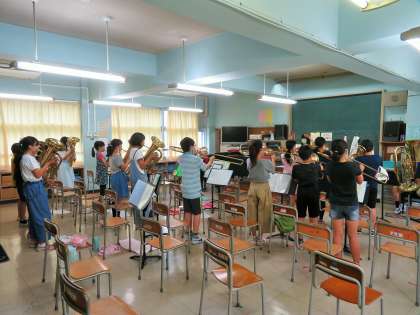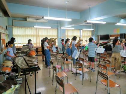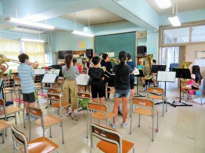 金管バンドの子どもたちは、毎日早起きをして朝練習を頑張っています。運動会の開会式で演奏予定の「ファンファーレ」と、閉会式で演奏予定の「校歌」を練習をしています。