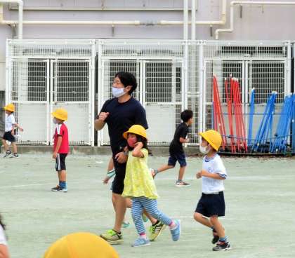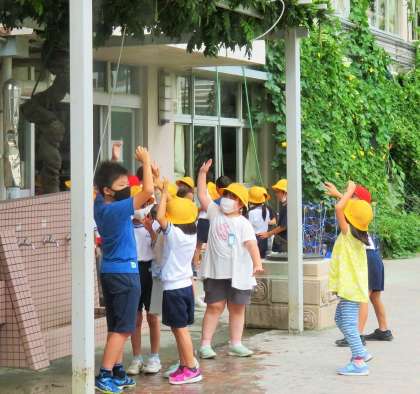 チャイムが鳴ると一斉に校舎に戻ります。ミストシャワーが2ヶ所に増えました。人気スポットです!