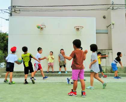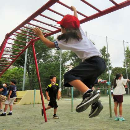 始業前の朝遊びに毎日取り組んでいます。鬼ごっこやボール遊び、一輪車、うんてい、ジャングルジム、登り棒、鉄棒が人気です。