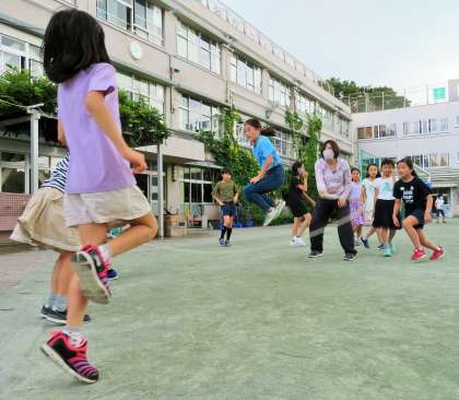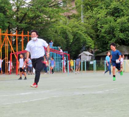 休み時間は、子どもと教師が一緒に遊ぶ「共遊び」を奨励しています。
