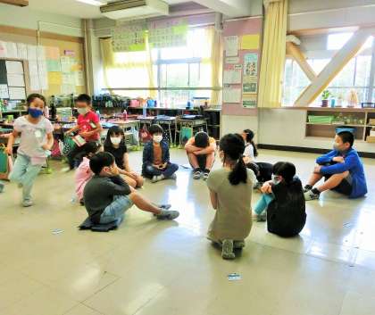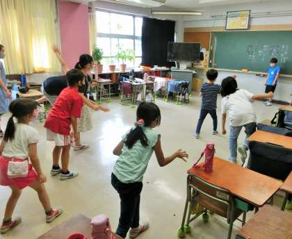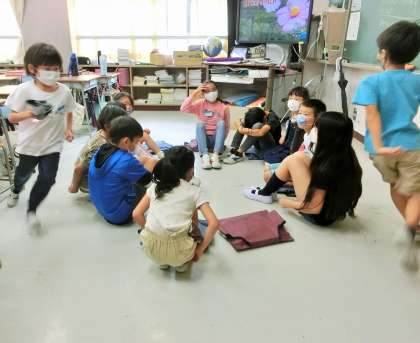 蜜を避けるため、教室、屋上、体育館、校庭に分散して遊びました。教室では「ハンカチ落とし」や「だるまさんが転んだ」で遊んでいました。