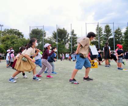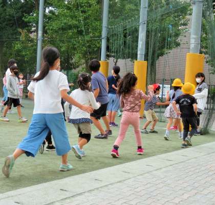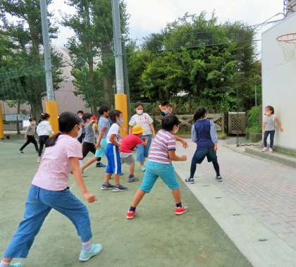校庭で「だるまさんが転んだ」をして遊んでいる様子です。