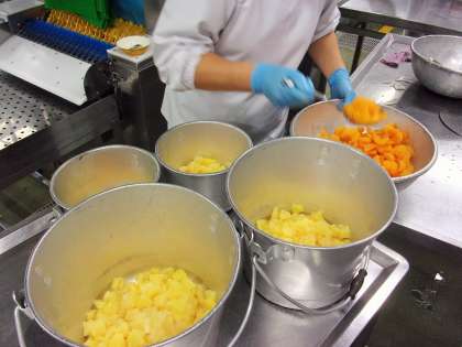給食では手作りしたシロップとみかんとパインアップルの缶詰を使って作りました。