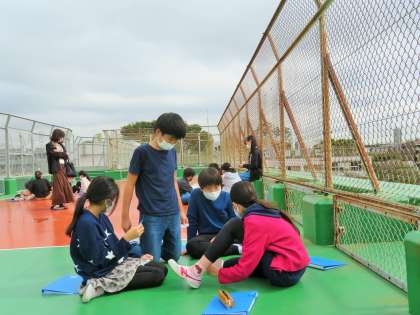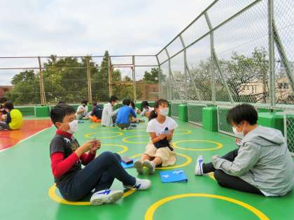 英語のアクティビティは、感染症予防のため屋上にて「青空教室」で行いました。男女仲良く、とっても楽しそうでした!