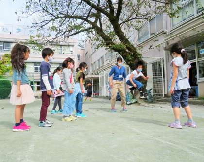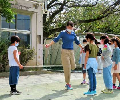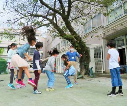 3年生は、昔懐かしい「ゴム跳び?」「ゴムダン!」をして遊んでいました。ゴムを跳び越える技の工夫を楽しむ遊びで、私も小学生の時によく遊びました。