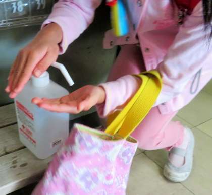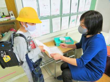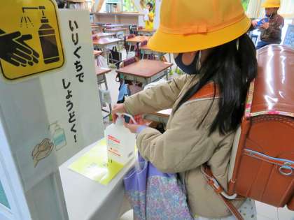 教室に入る際には、引き続き「健康観察カード」を提出し、手洗い、アルコール消毒を徹底しています。