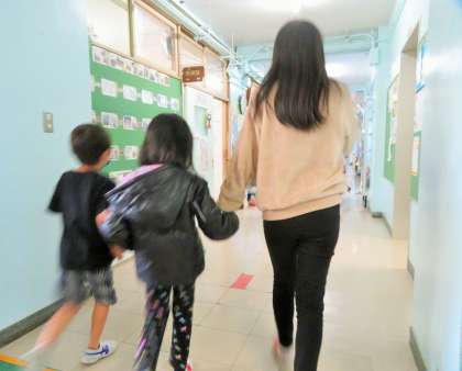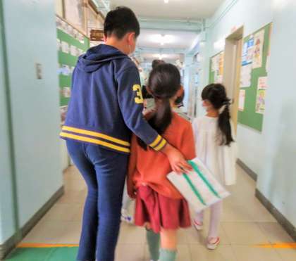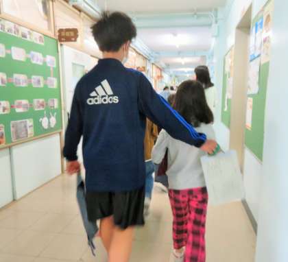 今日の昼休みは「たてわり班集会」です。松丘小学校の重点目標の一つとして、思いやりの気持ちをさらに向上させるための活動です。一つの班に1年生から6年生までが入って縦割りの集団で遊びます。まずは、6年生が1年生のお迎えです。
