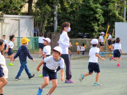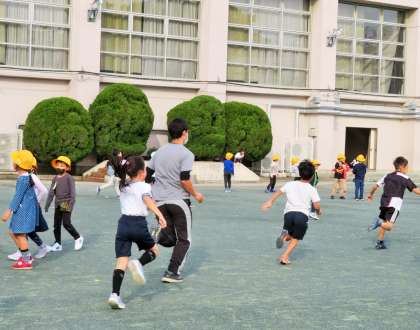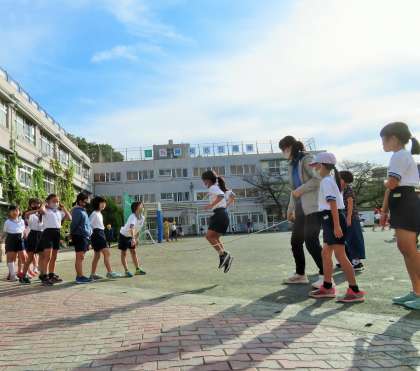 多くの先生が子どもたちと一緒に遊んでいます。私も2年生と鬼ごっこで遊びました。どんどん輪が広がって楽しかったです!
