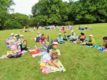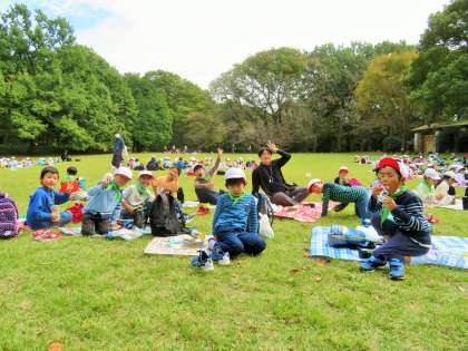 「秋見つけ」の後は、待ちに待ったお弁当タイムです。学校から持参した泡石鹸でしっかりと手を洗ってからいただきました!