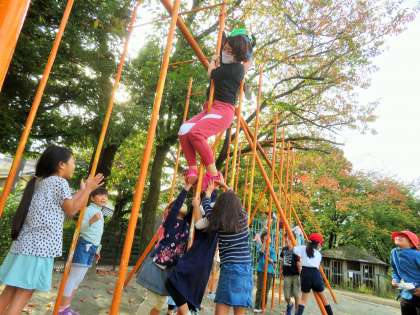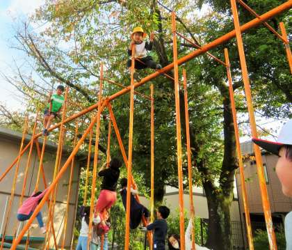 鬼ごっこやボール遊び、一輪車、うんてい、登り棒、鉄棒が人気です。担任の先生も登り棒に挑戦です。子どもたちの応援があり、てっぺんまで登ることができました!