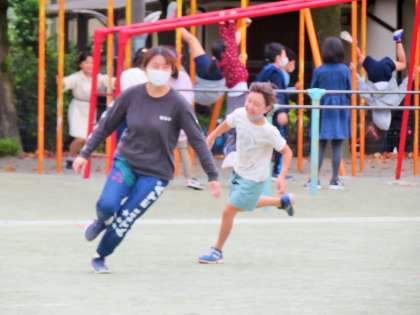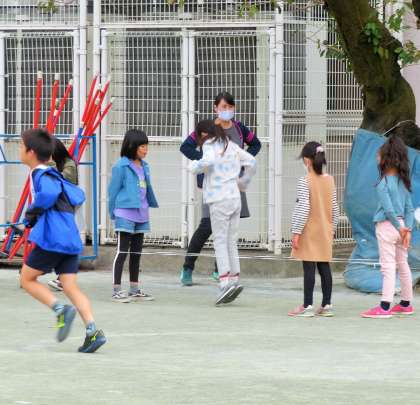 先生と一緒にゴム跳びをしたり鬼ごっこをしたりして遊んでいます。