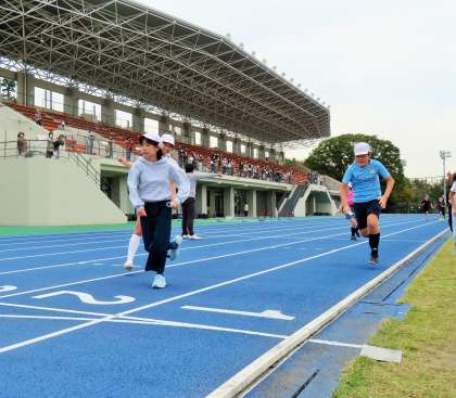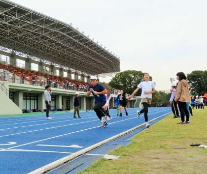 次は、クラス対抗の全員リレーです。バトンパスの練習は決して十分とは言えませんが、これこそ学級のチームプレーです。