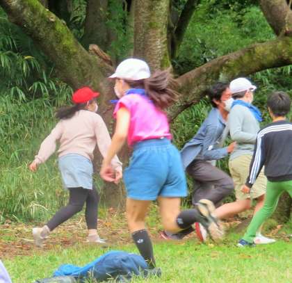 先生と一緒に鬼ごっこを楽しんでいる子どもたちの様子です。