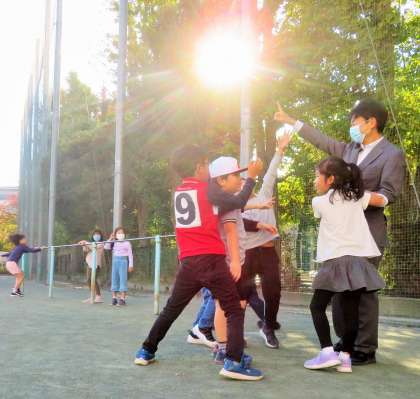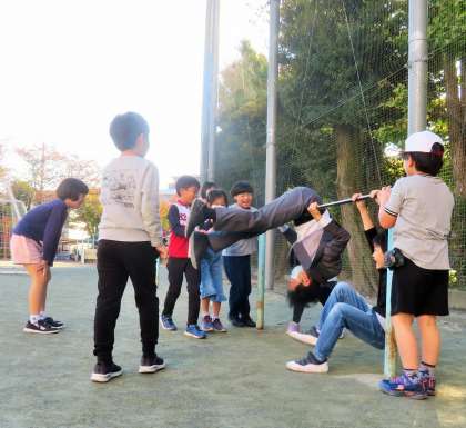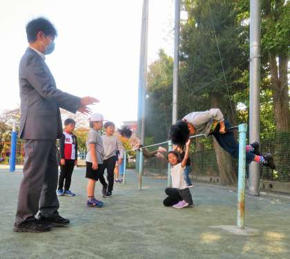 私が南門であいさつをしていると、2年生が私を見つけて朝遊びへと連れていきます。今日は、鉄棒と鬼ごっこをして遊びました。