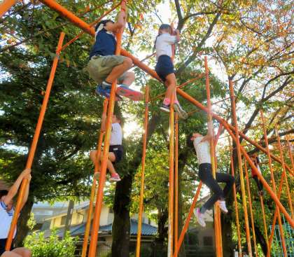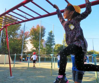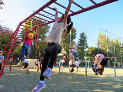 始業前の朝遊びに毎日取り組んでいます。ボール遊びや一輪車、うんてい、登り棒、鉄棒、ジャングルジムが人気です。