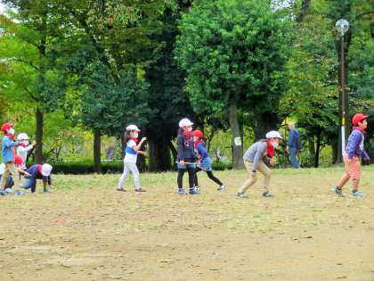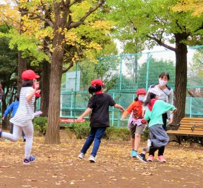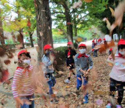クラス遊びをしている様子です。だるまさんが転んだ、鬼ごっこ、ふかふかの落ち葉で遊んでいるクラスもありました。