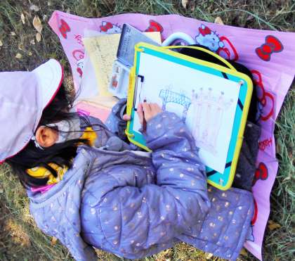高さ30メートル、直径17メートルもの大きさの給水塔。高さの3分の1まで水が貯められているそうです。災害に備えての対応と聞きました。間近で見るととっても大きく、子どもたちは驚きながらスケッチをしていました。