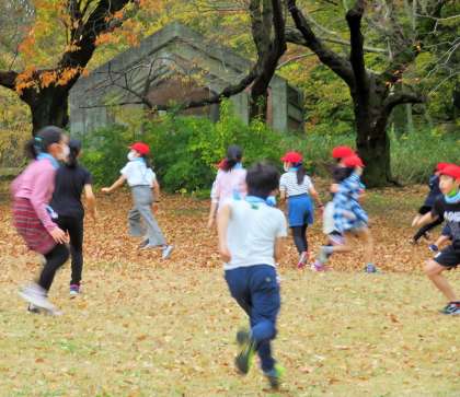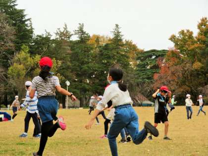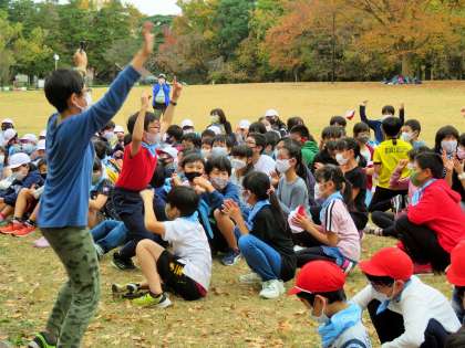 写真は、3色鬼ごっこと、結果発表の様子です。