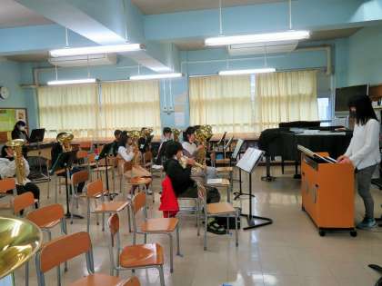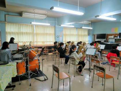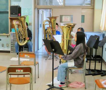 金管バンドの朝練習は、毎日続いています。音楽室に入ると、いつも「おはようございます!」の爽やかなあいさつがあり温かい気持ちになります。