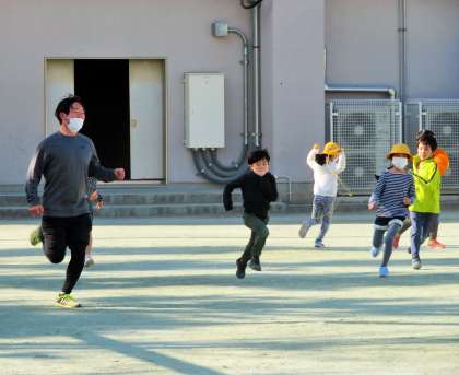 休み時間は先生と一緒の「共遊び」です。先生も一緒になって遊びます。松丘小学校の特色の一つとして、「教師は常に子どもと共にある」という考えをもちながら行動しています。