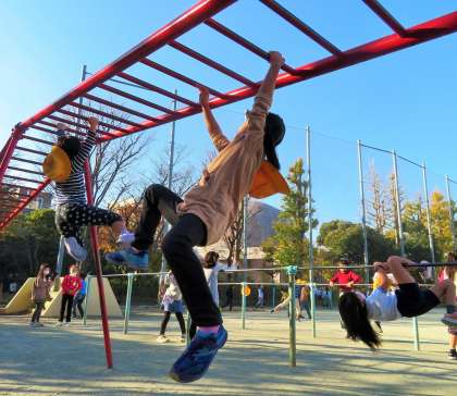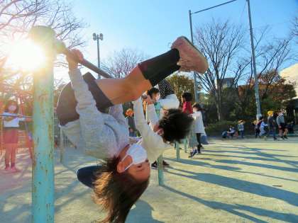 休み時間の校庭には固定遊具で遊んだり先生との「共遊び」の姿が見られたりで笑顔がいっぱいです。私は、外遊びが体力づくりの原点と考えています。