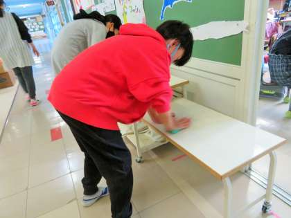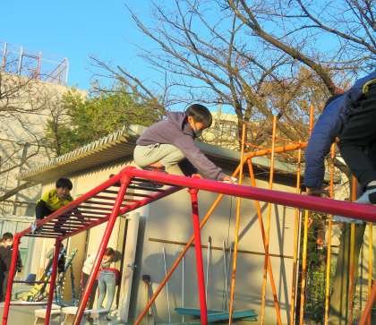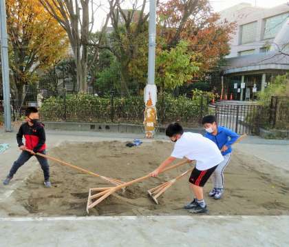 運動委員会は、砂場の砂入れと整地、うんていやジャングルジムの消毒をしました。