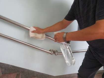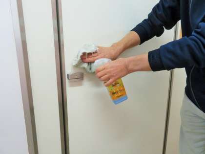 子どもたちの休み時間後、下校後には、主事がトイレ、手すり、ドアノブ、スイッチなどの消毒を行っています。