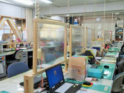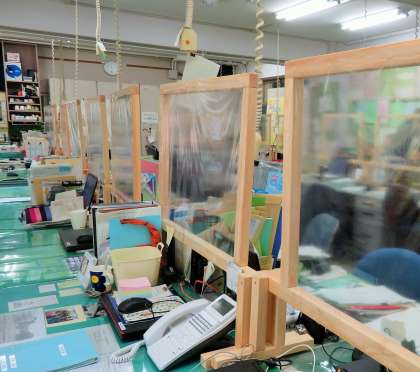 松丘小学校では、職員室からクラスターが発生しないように、11月から主事手作りのパーテーションを設置しています。換気はもちろん、昼食はお互い離れた机で給食を食べる、学年会はそれぞれの教室で行うなど、感染症対策を徹底しています。