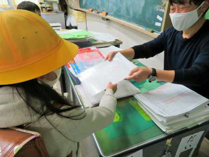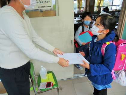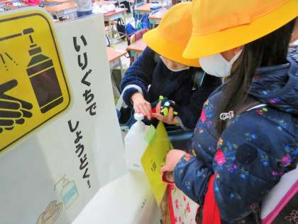 感染症の予防対策として、引き続き教室に入る際には、アルコール消毒をして「健康観察カード」の提出を徹底しています。