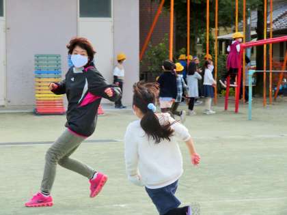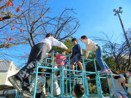 私も2年生と鬼ごっこですが、ジャングルジムに逃げ込む子も多くなりました。手が届きそうで届かない・・・。子どもたちが落ちたりしないよう十分気を付けて遊びます!