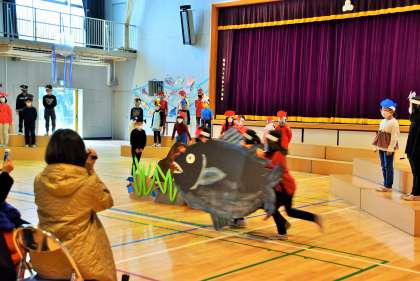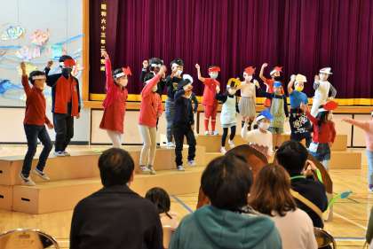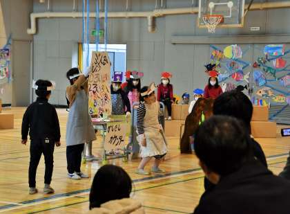 2年生は「スイミーのぼうけん」です。国語科では「スイミー」日記を書いて、スイミーの思いについて深く考えました。また、生活科では「町たんけん」で地域の方々のお仕事について調べたりお話を伺ったりすることで、この地域のことがもっと好きになりました。SDGsの、14海の豊かさを守ろう、11住み続けられるまちづくりに関連させた構成となっています。構成や配役は学年で統一していますが、随所にクラスの子どもたちのアイデアがふんだんに含まれた発表となりました。
