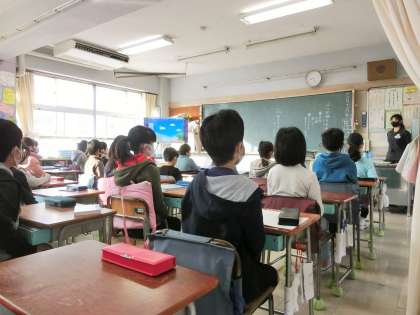 写真は、放送朝会を聞いている4年生、6年生、2年生の様子です。