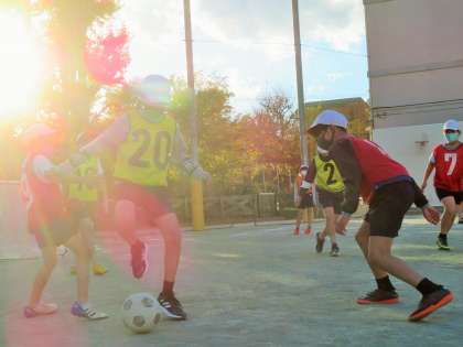 写真は、ミニサッカー、鬼ごっこ、実験クラブの様子です。