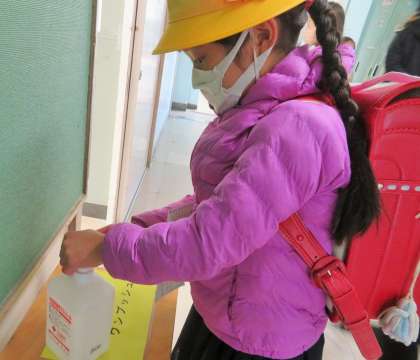 引き続き教室では担任が霧吹きを使用して湿度を高めています。教室に入る際には、アルコール消毒と「健康観察カード」の提出を徹底しています。