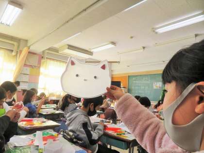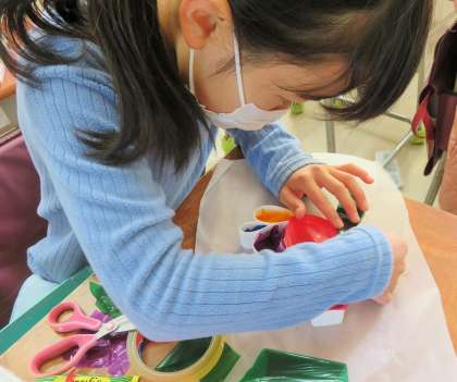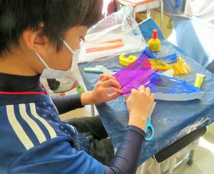図工の学習では、光にあてながら形や色の組み合わせを工夫しています。