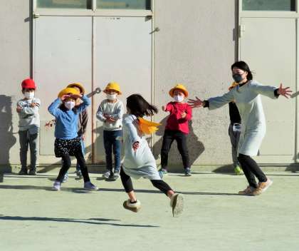 休み時間は先生と一緒の「共遊び」です。先生も一緒になって遊びます。松丘小学校の特色の一つとして、「教師は常に子どもと共にある」という考えをもちながら行動しています。