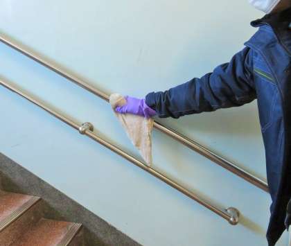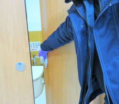 子どもたちの休み時間後や下校後には、主事がドアノブ、手すり、スイッチなどの消毒を行っています。