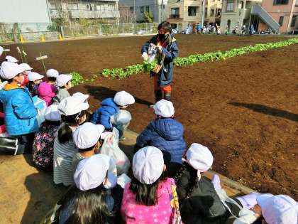 今日は1年生が近くの秋山農園で小松菜採りをしてきました。現在、緊急事態宣言発令中ですので、区のガイドラインでは校外学習は基本的に中止又は延期ですが、近所であること、クラスごとに三蜜を回避して行くことを条件に特別に認めていただきました。