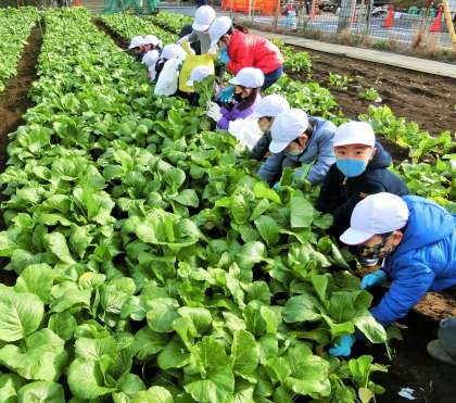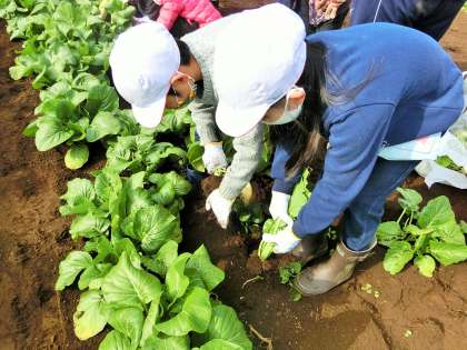 子どもたちは、農園での説明をしっかりと聞き、”まぼろしの小松菜”の香りやさわり心地を楽しみながら収穫をしていました。